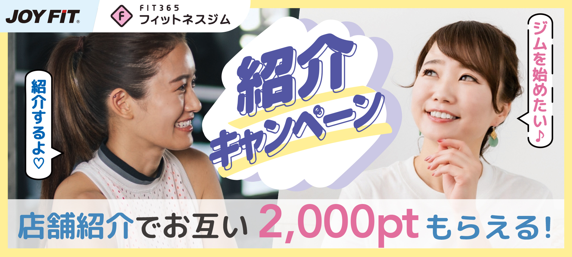 ※紹介者様と同じ店舗のご紹介はキャンペーン適応外となります。(例:JOYFITに所属している方はFIT365、FIT365に所属している方はJOYFITの紹介をお願い致します)※何人でもご紹介、適応いただけます。※紹介されたお客様が入会されてからキャンペーンが適応されます。